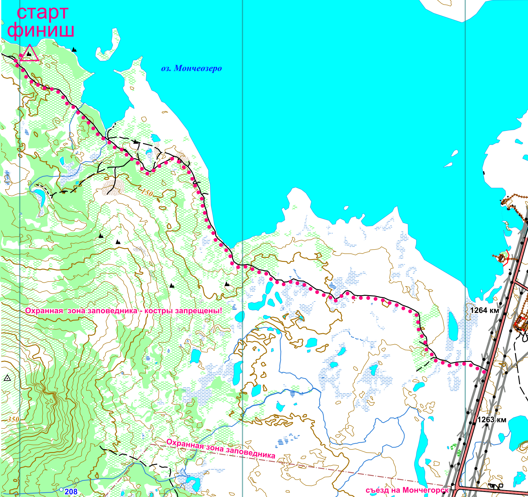 Бо́льшая часть дистанции, в том числе старт/фишиш, находится в охранной зоне Лапландского заповедника, где запрещено разведение костров, сбор грибов и ягод, охота и рыбная ловля. Заходить на территорию самого Лапландского заповедника запрещено! Границы заповедника и его охранной зоны отображены на карте, но на пути вашего движения опознавательных знаков может не быть. Вам необходимо самостоятельно контролировать своё местоположение относительно этих границ.