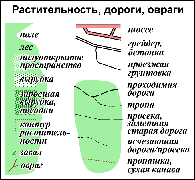 Карта имеет масштаб 1:40000 (1см = 400м), сечение рельефа 20м (это результат нашего выбора источника рельефа – ГГЦ, где горизонтали прорисованы аккуратно, но редко). Листы карты – формата А4, напечатанные с двух сторон. Карты ориентированы на магнитный север, линии магнитного меридиана проведены с интервалом 2км. Материал карт синтетический, не нуждающийся в герметизации. Но карты требуют осторожного обращения: не тереть увлажнённые поверхности, избегать попадания репеллентов и апельсинового сока. Отображение наиболее важных для ориентирования объектов – как на картинке справа.