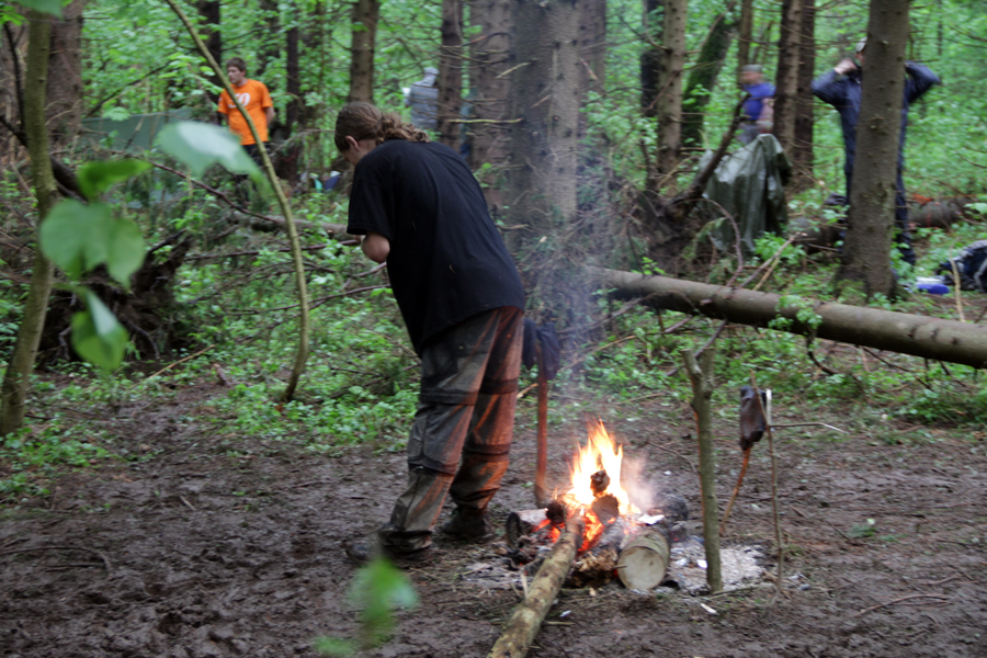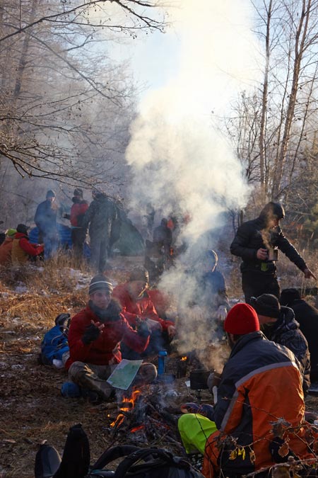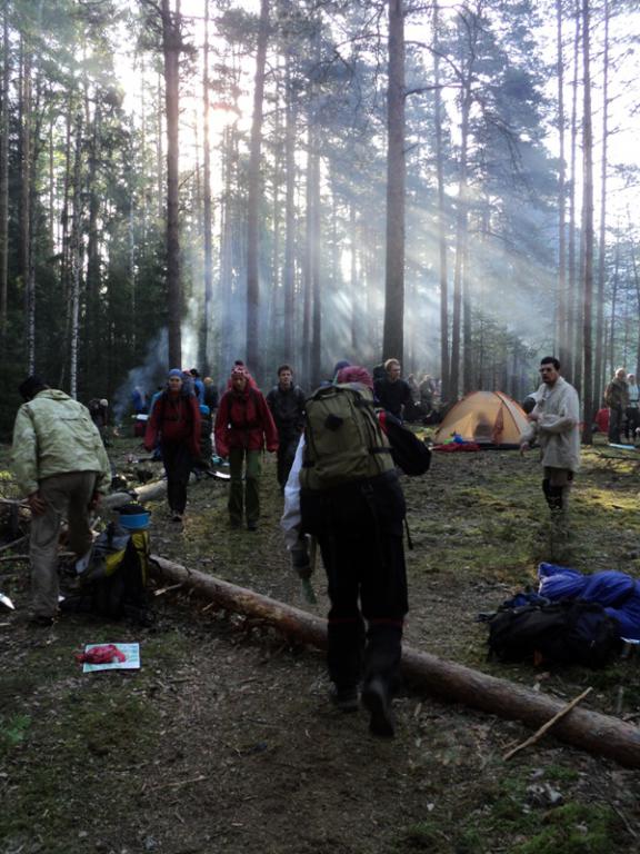 Всё началось в 2013 году, когда толком не было навигации, инфраструктуры, зонирования, внешнего отличия между судьями и участниками. Участники просто усеивали лес и пришедшим поздно было вообще тяжко найти место. Постепенно появлялись подходы к воде, судейская зона, иногда дрова, чай и костер участников — но это был не город, а скорее зачатки инфраструктуры. Ну очень надо, чтобы не мутили воду выше водозабора, поэтому делали маркировку.